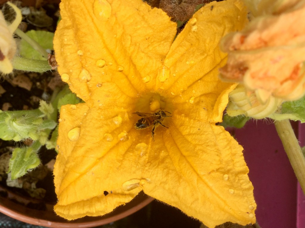 This year I decided to grow flowers & veggies in a bid to do a little bit more for the planet and today is world honeybee day, in my excitement over bees I actually found some honeybees in the garden and while Sunflowers seem specially designed to attract bees, courgette flowers are just as good!