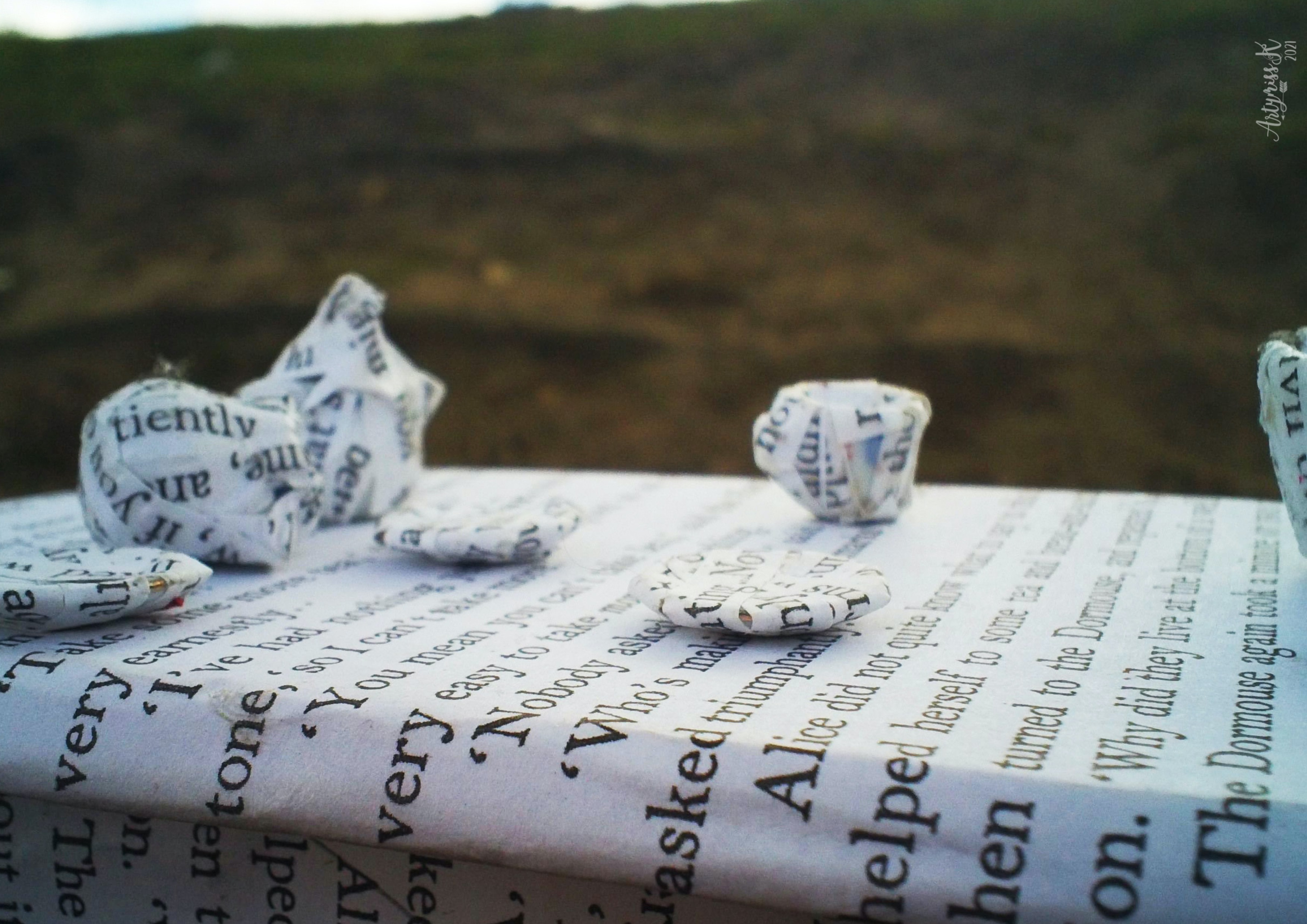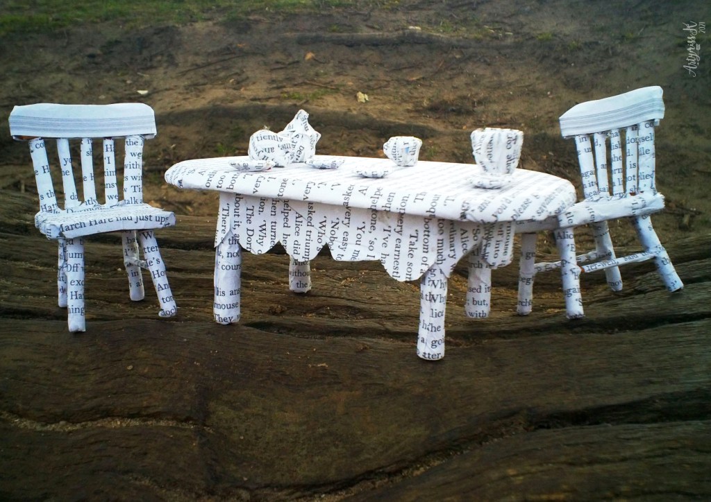 I made this when I was a Uni as a part of my finals as part of an Alice in Wonderland project. It’s not using actual book pages (I could never destroy a book like that!) but is from photocopies from a book. The paper was then rolled or lined with card to help it keep its shape.