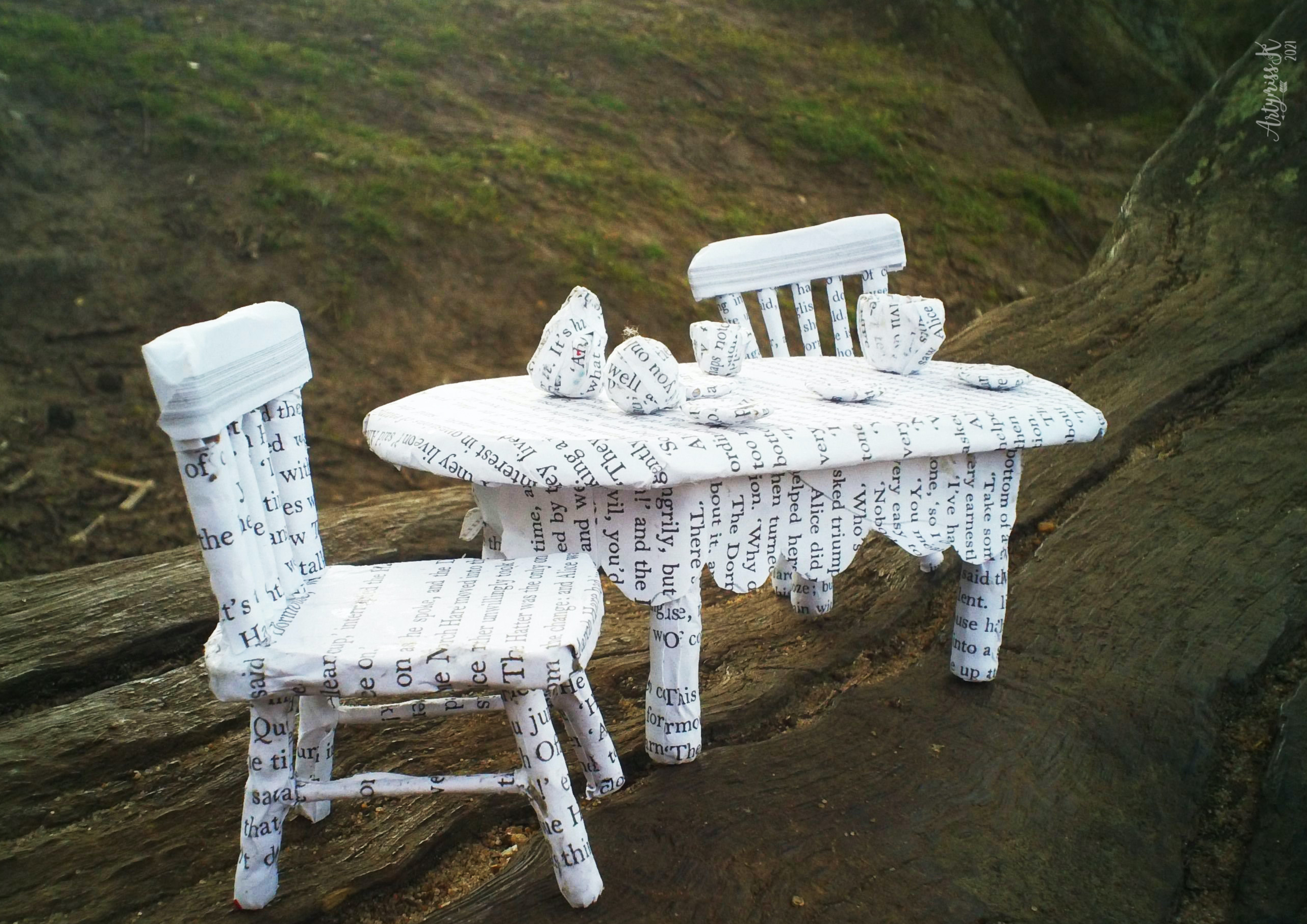 The unexpectedly small tea party. Created using paper, unsurprisingly this took longer than expected. Its made to be about the same size as dollhouse furniture (I think its 1/12 scale) and then I covered some dollhouse dishes. I made it years ago and found it recently, can’t believe its still holding together!