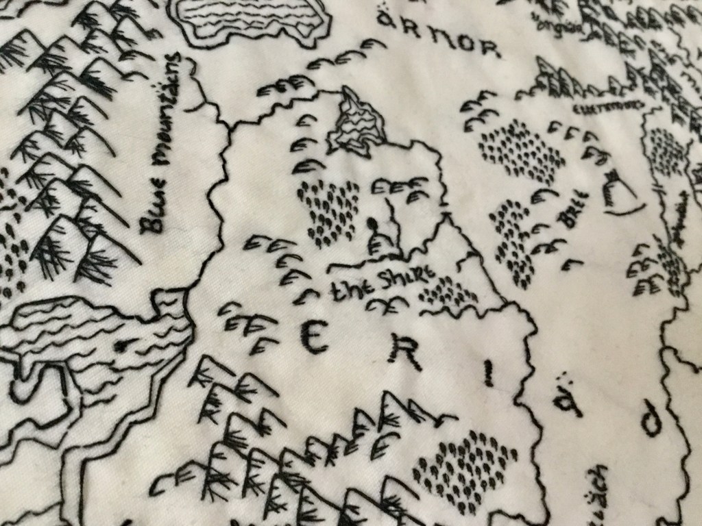 I often think Middle Earth is my happy place, so a project like this has been really enjoyable. In the end I turned it into a wall hanging. The map is sewn using one strand of black cotton thread and took about six weeks to finish. I started by drawing a copy of the map onto the correct sized paper for scale and then very faintly redrew it onto an appropriate sized piece of cotton before sewing it a little at a time. The trees took quite awhile but were so much fun!