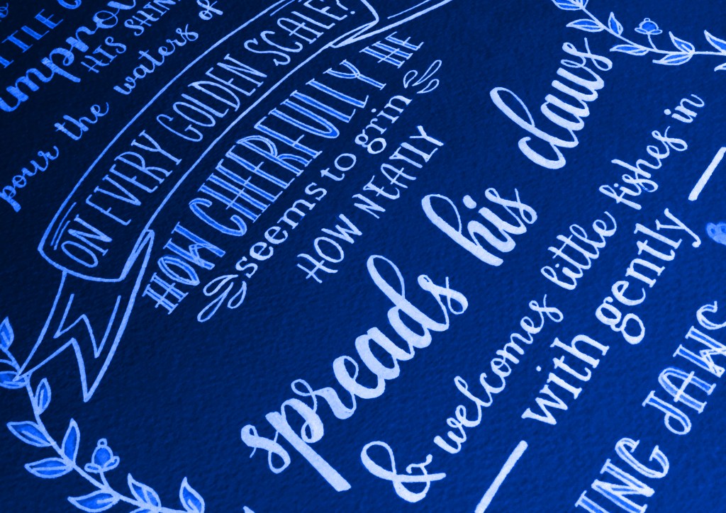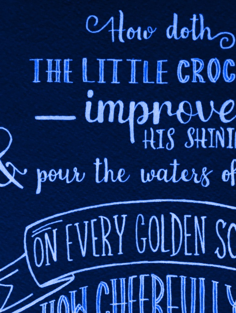 “How Doth the Little Crocodile” is a poem by Lewis Carroll which appears in his 1865 novel Alice’s Adventures in Wonderland. Alice recites it while attempting to recall “Against Idleness and Mischief” by Isaac Watts. It’s such a brilliant little poem and has always been one that stuck in my head.
