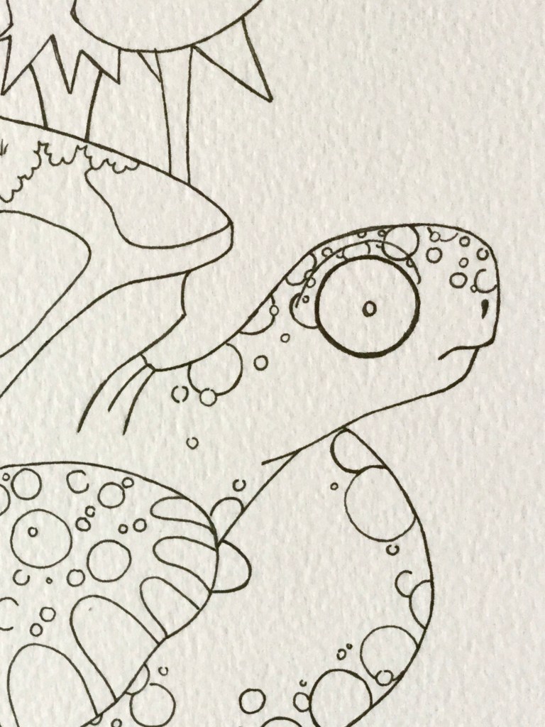 Theres a really clever trick with drawing (and painting) of layering your image so it doesn’t seem flat – literally putting trees in front of and behind the castle make it more ‘in the middle’ and drawing the far side flippers of the turtle gives him depth.