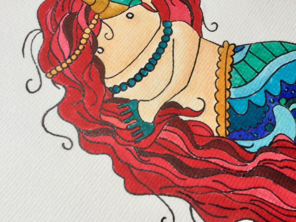 I wasn’t actually planning to colour her hair red, but when thinking mermaid Ariel always comes to mind. It was clever of Disney because in the original story Andersen gives no clue as to the colour of the mermaid’s hair, but she does grow red flowers in her patch of garden. I’m thinking that I might draw several mermaids…or maybe other characters form old fairy tales.
