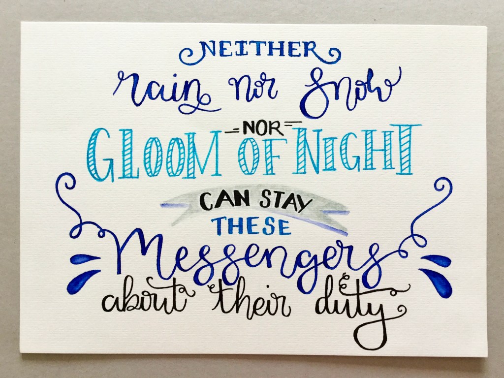 I used my arteza water brush pens and a really fine paint brush to create this piece and think the uses of different fonts work together really well. I also chose to use shades of blue as the postmen of Ankh–Morpork wore spiffy blue uniforms.