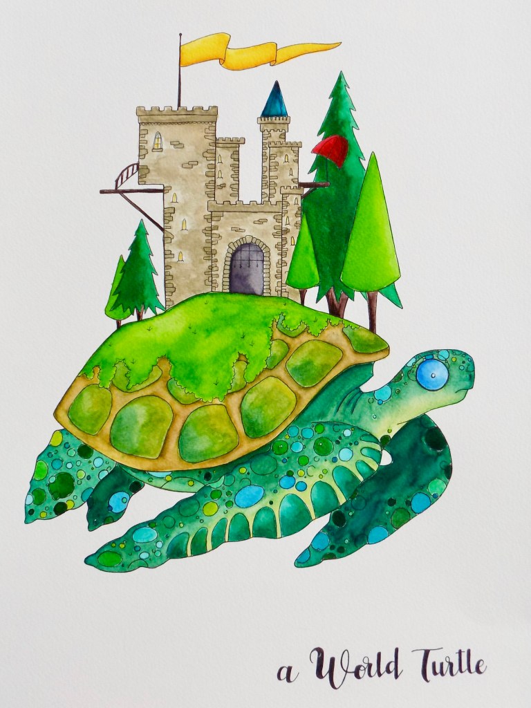 Just a little art post this week, for world turtle day (23rd May) I posted a pen illustration of a World Turtle. Well, I’ve actually finished it and I am so happy with this painting!! I wanted the trees to reflect the colourings of the turtle – which I decided had to be a greenish-blue and tried to give the castle a natural stone effect.