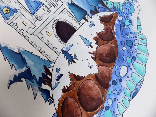 Like my other World turtle illustrations its A3 sized and is painted with Arteza watercolours and brush pens, with all the outlines in Winsor & Newton Black Indian ink.