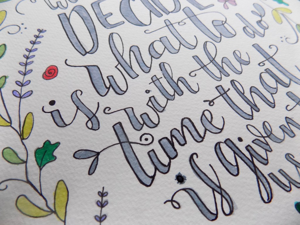 This week I thought I’d share my first hand lettering post of 2023. All we have to decide is what to do with the time that is given to us is a quote from J.R.R Tolkien’s Fellowship of the Ring. Professor Tolkien’s books are an endless supply of wise and beautiful phrases, that I really love turning into art.