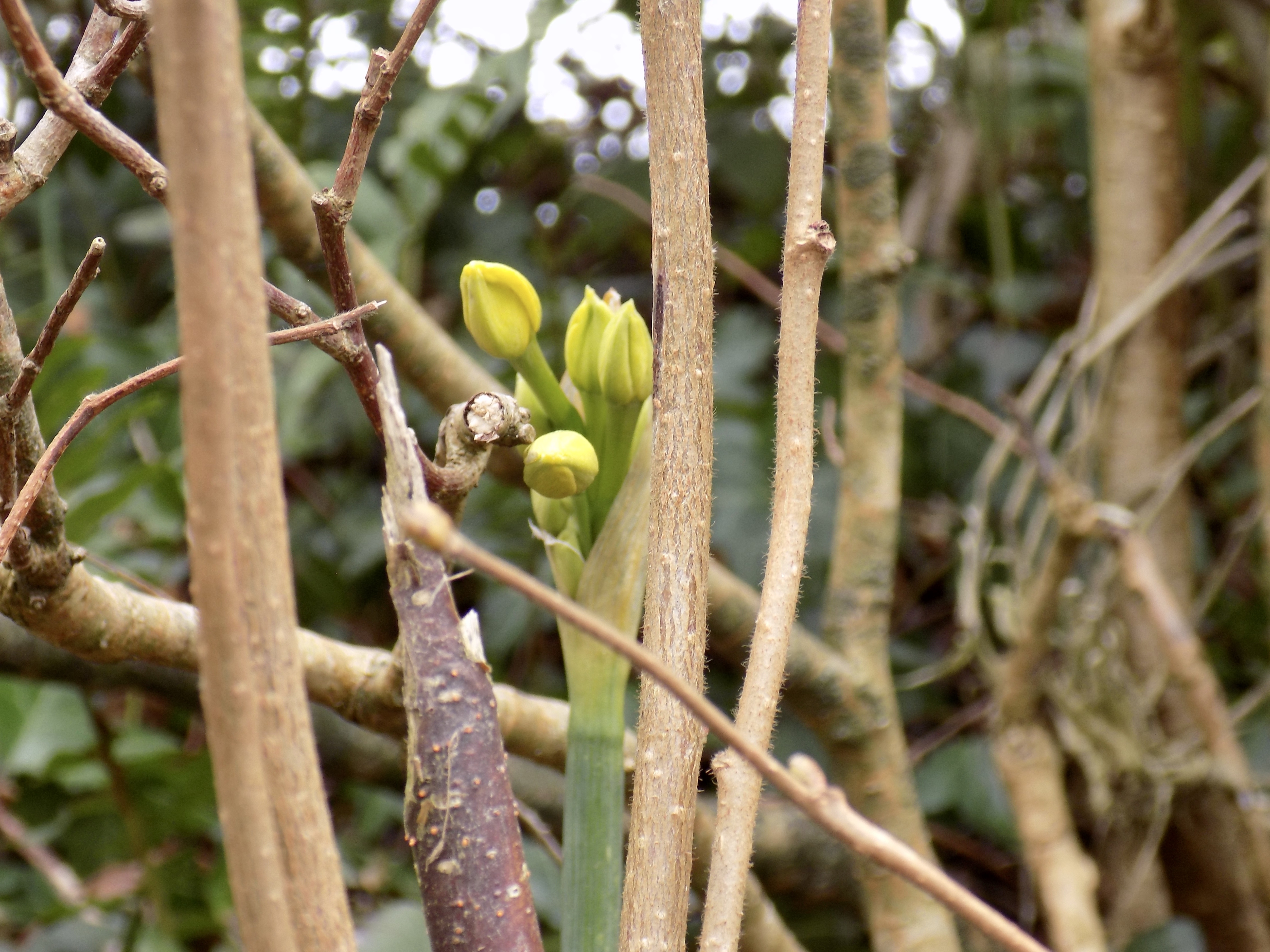 I’m fairly certain this is a multi headed daffodil (maybe) but I like how it looks ‘caged’ by the small dead branches.