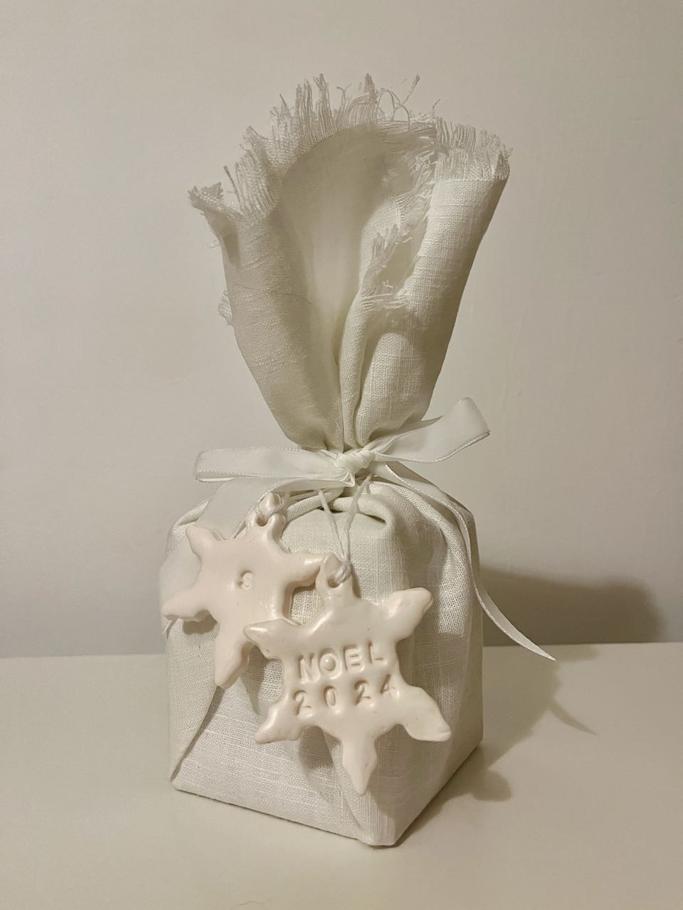 These little clay Snowflakes are made with white fimo (oven bake polymer clay). This is such a simple craft, it’s literally roll the clay out, attack with chosen cutters/stamps, bake, decorate if you want to. I just chose to keep them simple with the recipients initial and a cute Noel 2024, but you could go to town on making them look fancy.