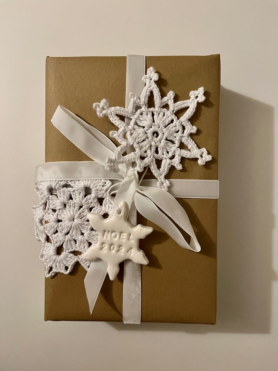 So I decided to create my own clay and crochet decorations and use them as gift tags! Its a super cute, less wasteful idea and the recipient can put it on their tree – it also works as an extra hand-made gift.