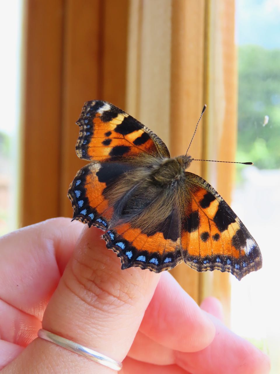 I’ve had a chance to raise a new surprise butterfly, a surprise Small Tortoiseshell butterfly to be precise. A few weeks ago I was sitting quietly in the garden enjoying an afternoon in the sun when this little guy crawled up my arm.