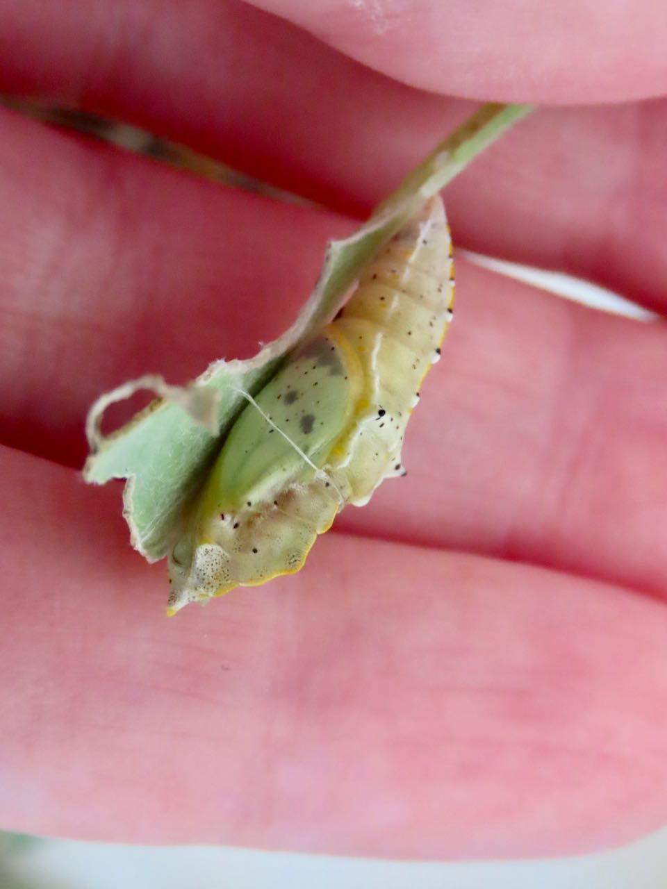 A few did escape (the perils of not checking the zip) but 29 of them stayed in the house and pupated. I love the 48 or so hours before the main event when the chrysalis becomes translucent and you can see the butterfly inside!