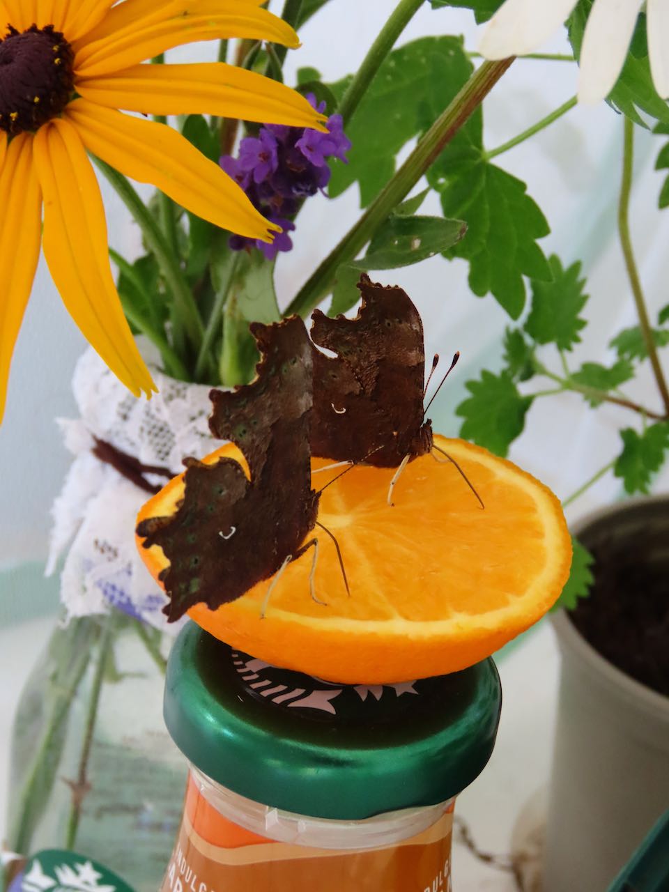 I really try my best to replicate the outside when I know I’ve got incoming butterflies and like to add a selection of flowers from the garden and orange slices for instant food.