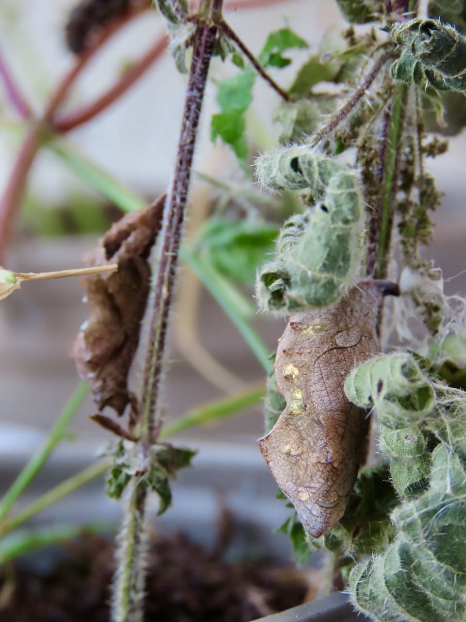 This photo is pretty helpful, as a Comma and a Red ad happened to pupate next to each other. The lighter curvy one at the front is the Red ad and the darker more angular one at the back is a Comma. I love the 48 or so hours before the main event when the chrysalis becomes translucent and you can see the butterfly inside!