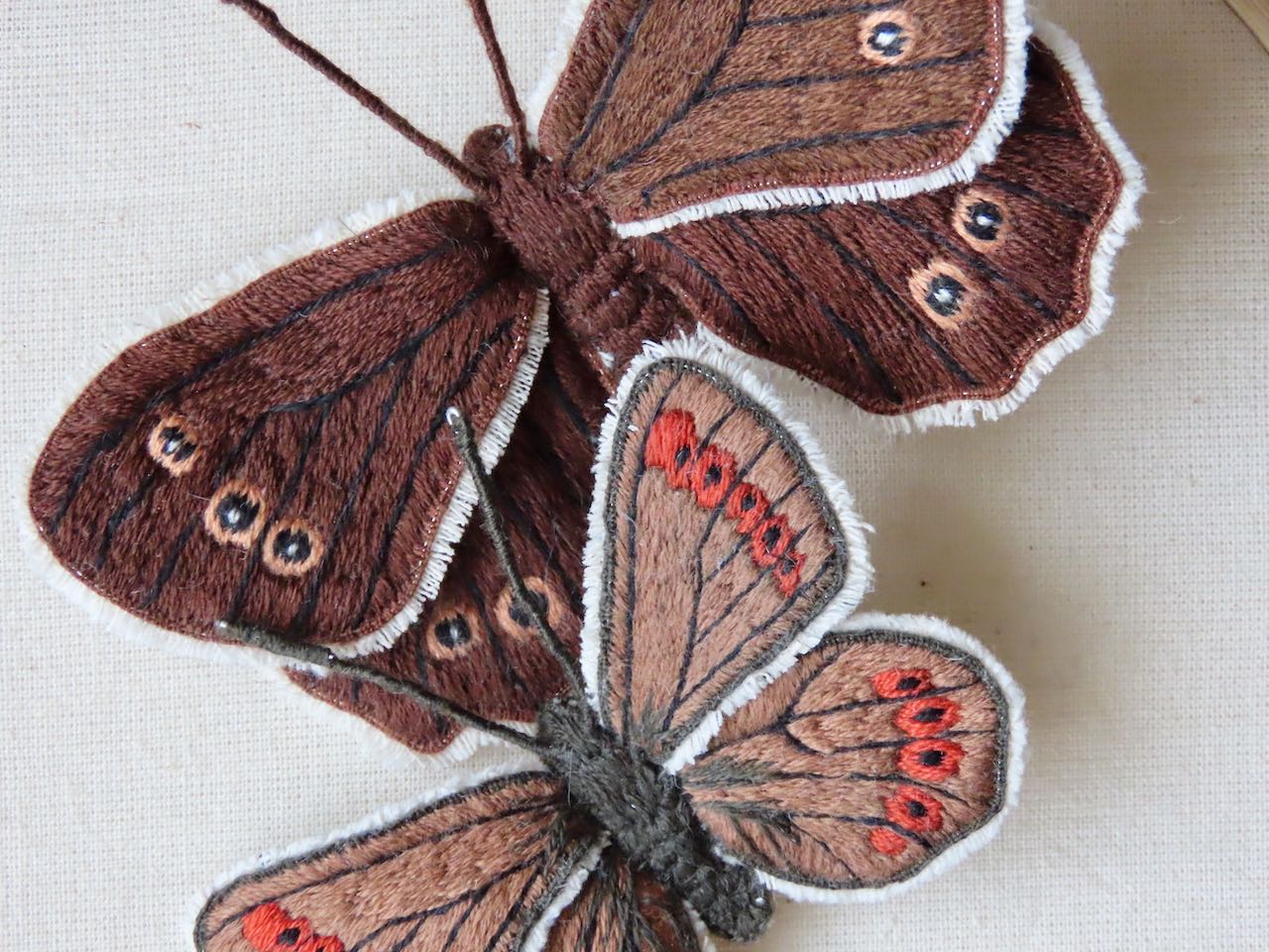 The much rarer Mountain Ringlet (the smaller one) – #19 on my embroidered butterfly challenge – is much smaller than their cousins, with a wingspan of 35mm (male) and 38mm (female) and are much darker brown with orange rimmed eyespots. Even when doubled my Mountain Ringlet still only has a tiny 7cm wingspan!