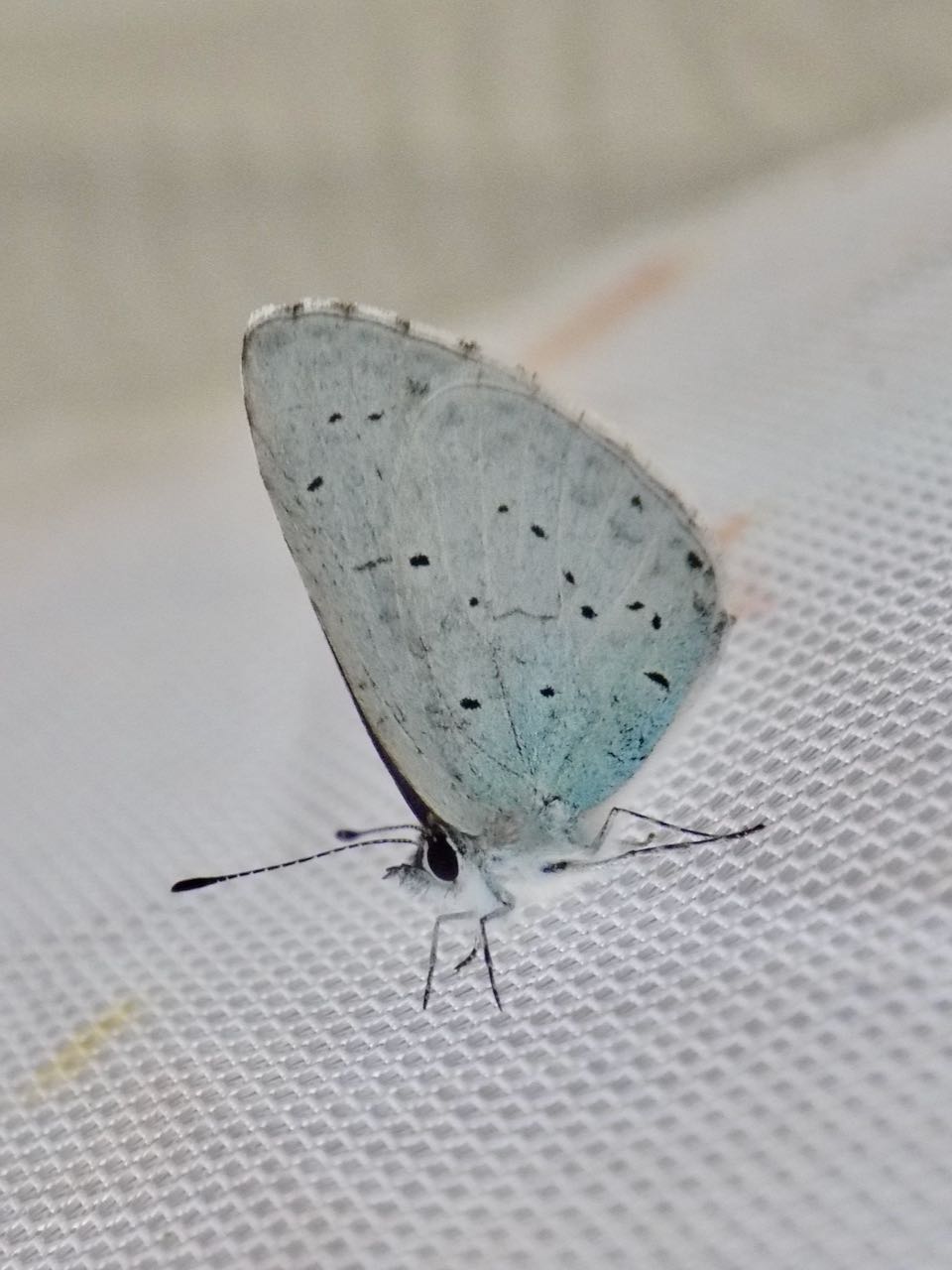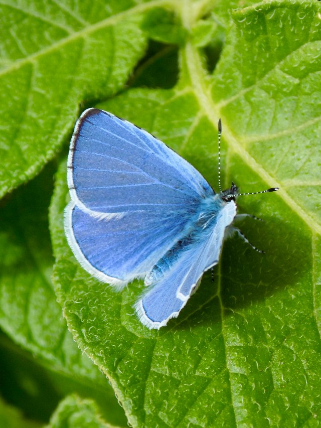 Holly Blue (Celastrina argiolus) is our earliest emerging and most common blue garden visitor they exhibit sexual dimorphism – the males have bright blue wings whiles the females are also blue but black wing edges. Both sexes have a tiny wingspan of just 35mm!