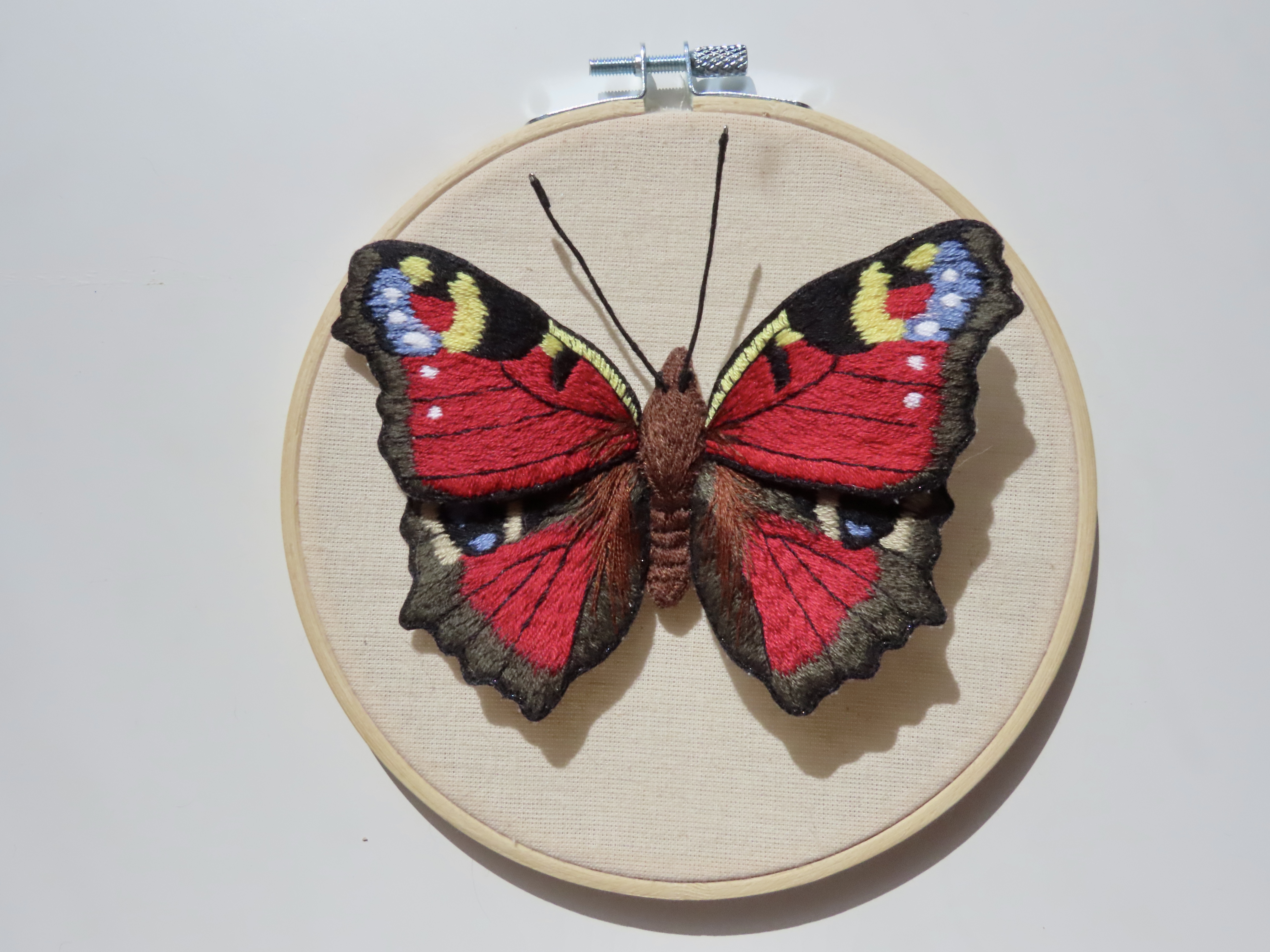 Last week I posted all about my recent experience of raising and caring for nine Peacock butterflies – a very pretty red fellow with large eye spots reminiscent of peacock feathers, I became so attached to the caterpillars and then later the butterflies in my care that I couldn’t help but want to create a needlework version as I really missed them once I released them into the wild.