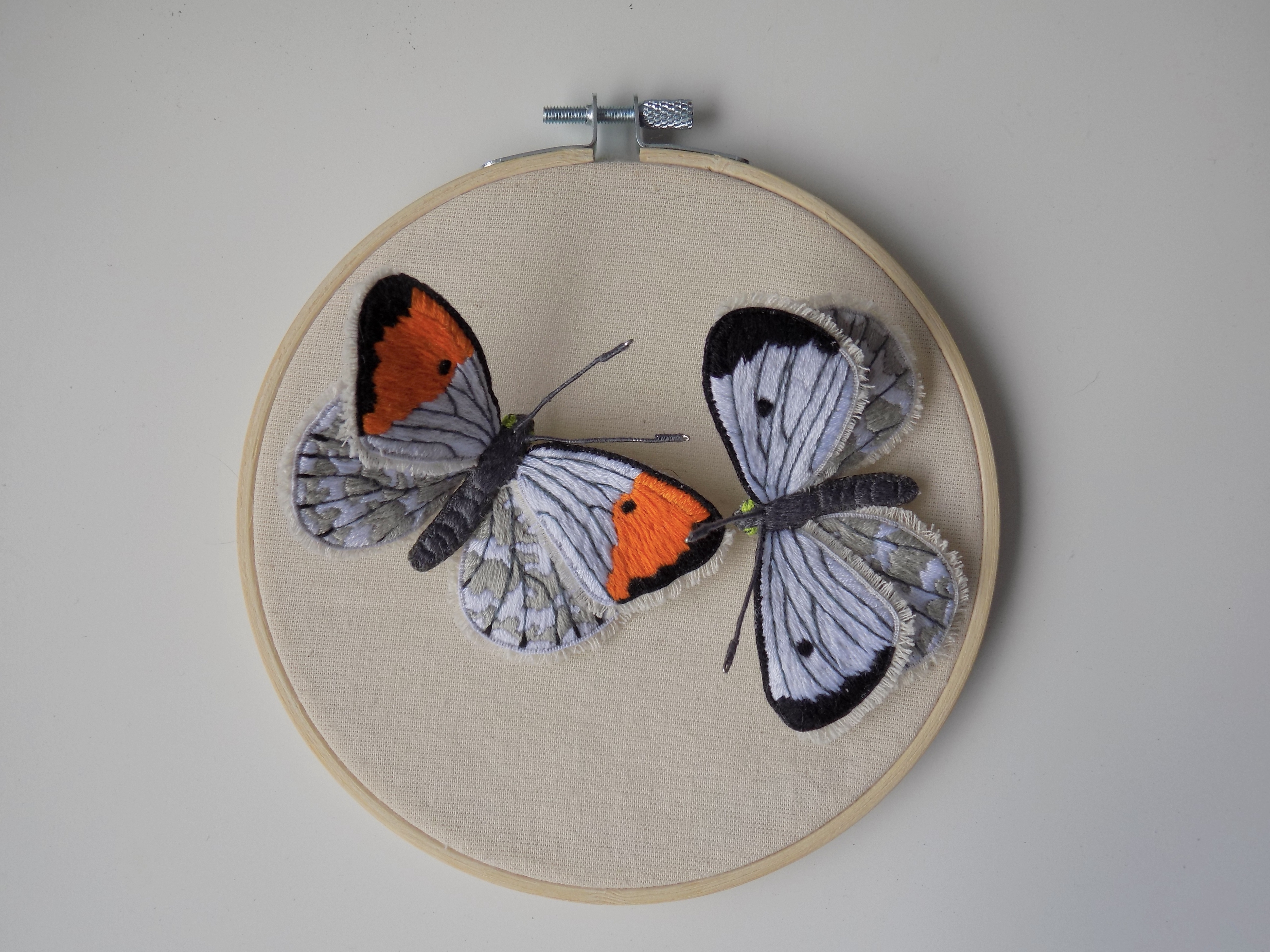 Similar to my Orange tip butterflies, you can easily distinguish between the two sexes of both types and can clearly see the size difference as well. They’re white with black wingtips (although the female have slightly creamy lower wings) and I thought it would be fun to create both a male and female, size wise the little pair of Small whites are about 7cm across (so they’re slightly smaller than the others I’ve already made!) While the Large whites have a wingspan of almost 14cm!! The body of each one has a crocodile clip sewn on so that I can attach the butterflies to plants, but I’ve also been wearing them in my hair.