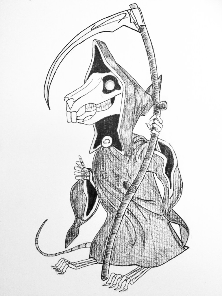 This week I thought I’d post a new illustration and I thought I’d share this one with you. Reaper Man is the 11th Discworld book by the comic and literary genius that was Sir Terry Pratchett, and is one of the best books out there (actually all the Discworld book are fantastic) Its main character is Death and later in the Death related books the Death of Rats arrives, the first of which is Reaper Man.